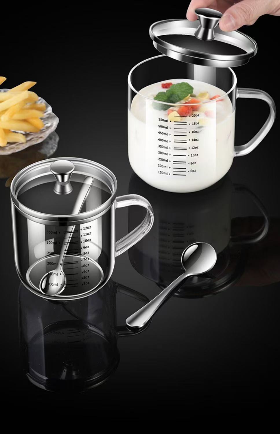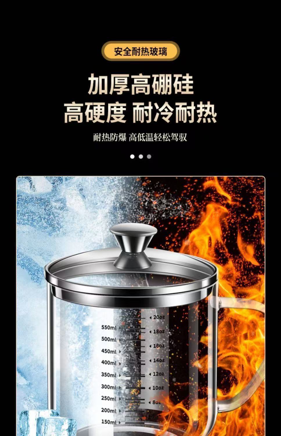 首页> 办公生活> 食品级高硼硅玻璃杯耐高温水杯大口径透明杯子双刻度带钢盖牛奶杯