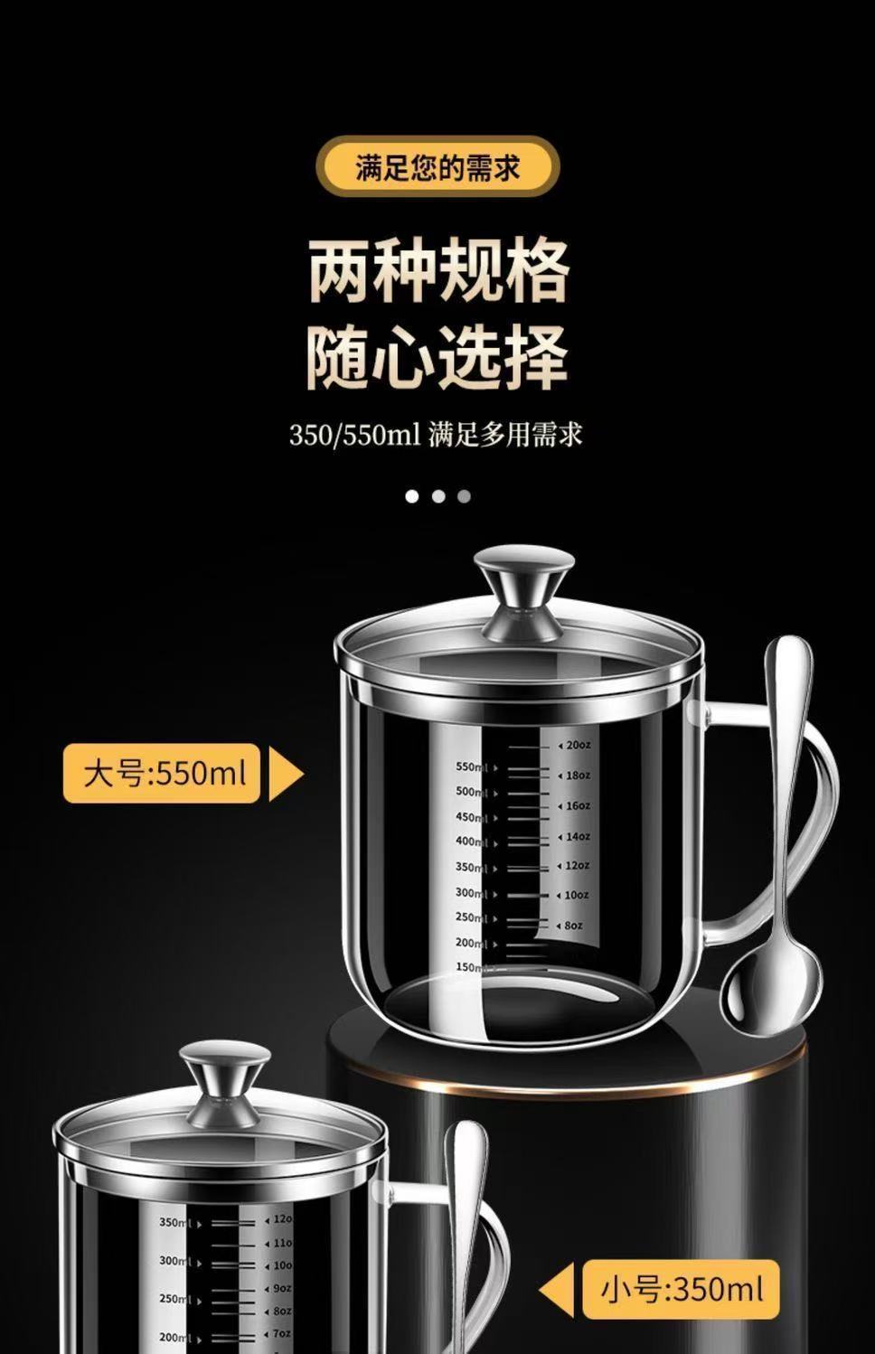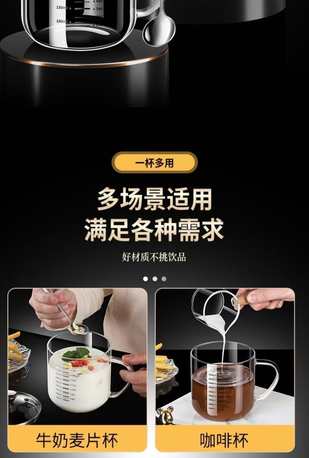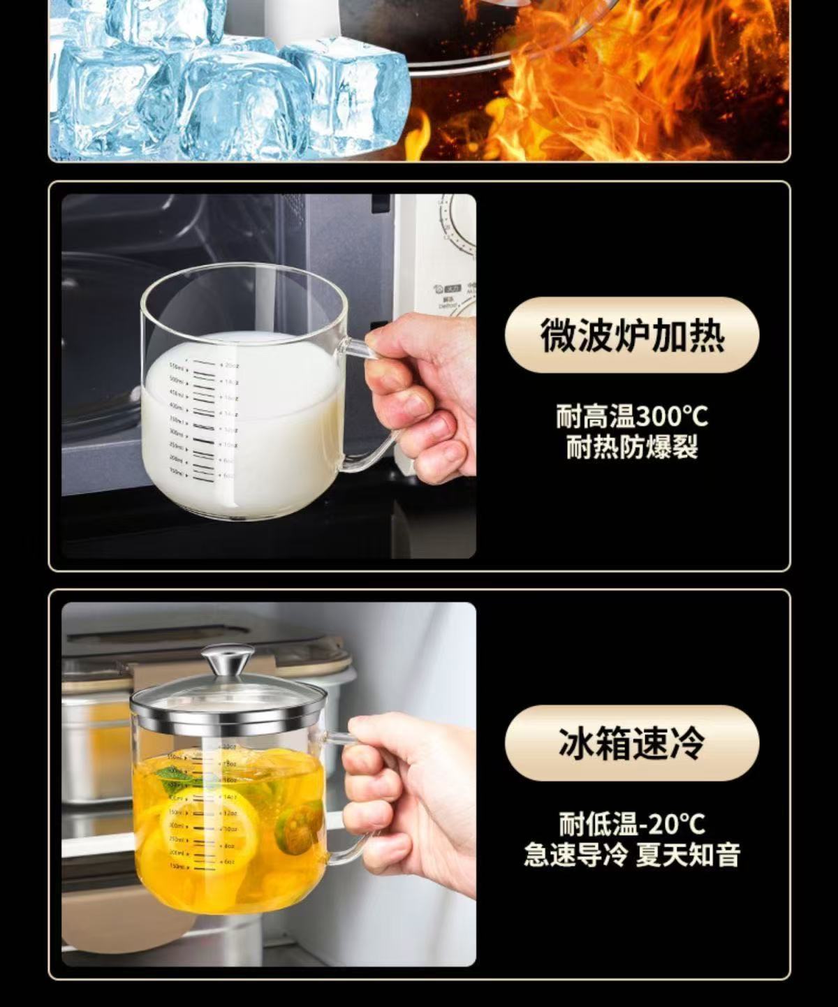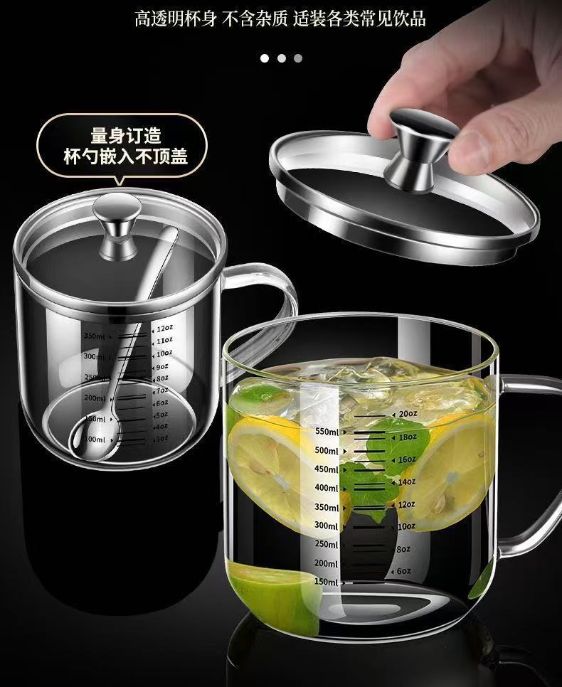 食品级高硼硅玻璃杯耐高温水杯大口径透明杯子双刻度带钢盖牛奶杯