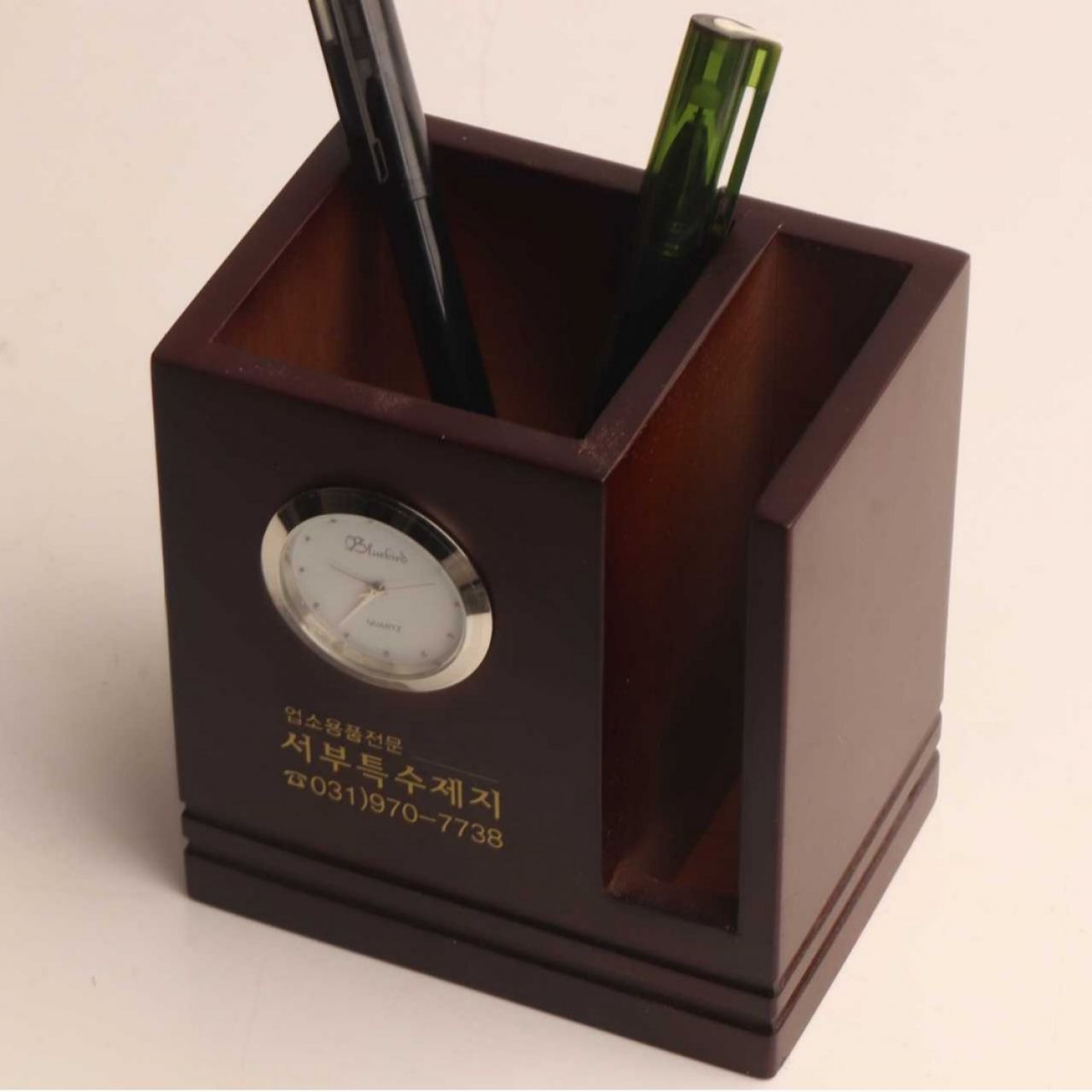 实木简约带钟笔筒创意时尚桌面商务办公文具收纳盒logo